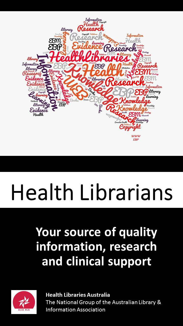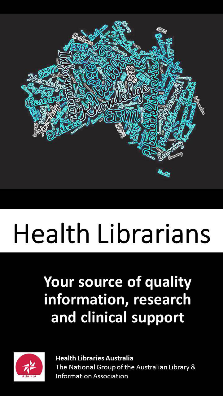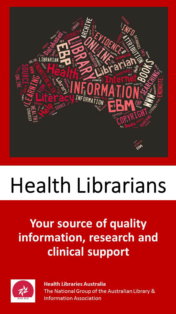 Health Libraries Australia (HLA) is the national professional organisation representing librarians and information professionals working in all health sectors including: hospitals and other clinical facilities, research institutes, regulatory agencies, pharmaceutical and biotechnology companies, government departments, regional health services, professional colleges, universities, cooperative research centres, not-for-profit and community organisations, and parts of public library services. The vision of Health Libraries Australia is that all Australians benefit from health library and information professionals’ expertise that is integral to evidence based health care.